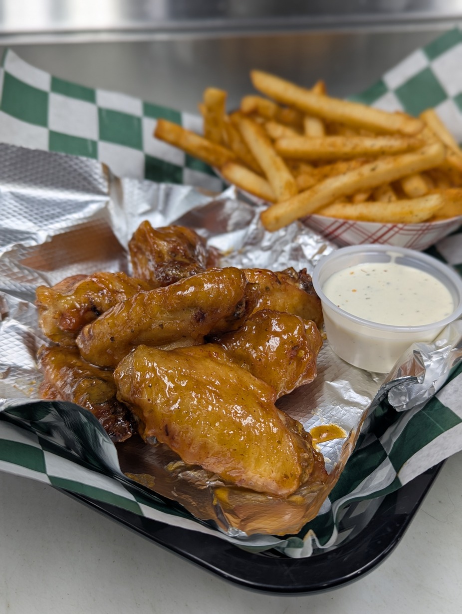 7 Piece Wings. Choice of One Sauce - Dry: Lemon Pepper, Old Bay or Dave’s Dust. Wet: Chipotle Honey Garlic, Carolina Buffalo, Mojo, Garlic Parmesan, Honey Sriracha or Nashville Hot. (Pictured with New House Made Mojo Sauce)Includes a side and a Drink for $16.00 **Upgrade your side to Okra or Onion Rings for $1.00