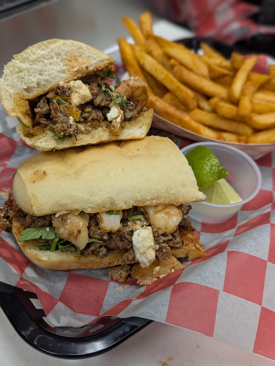 Baja Grinder - Steak and Shrimp with Onions, Peppers, Queso Fresco, Chipotle Aioli and Fresh Cilantro. Includes a side and a Drink for $18.00 **Upgrade your side to Okra or Onion Rings for $1.00