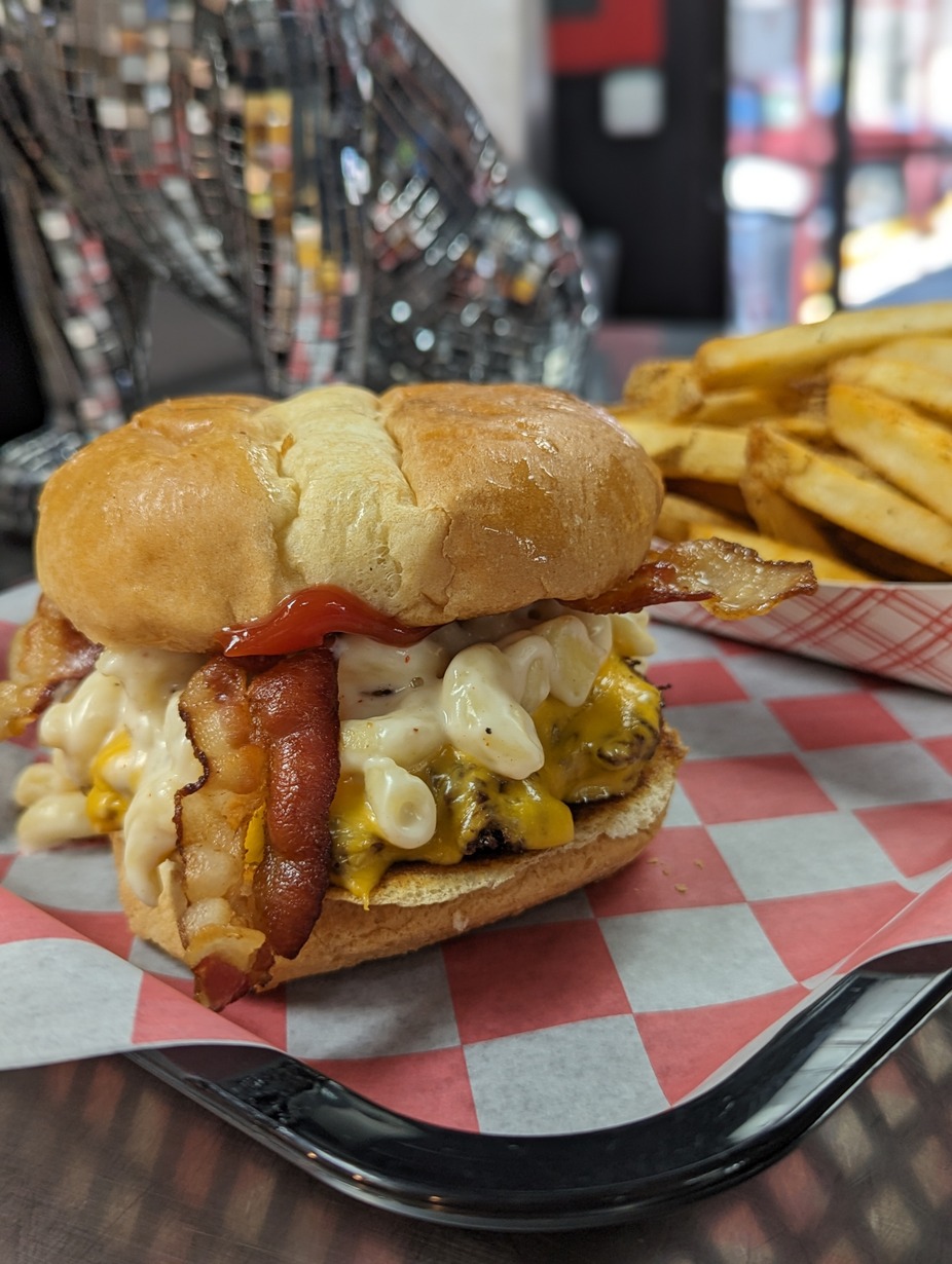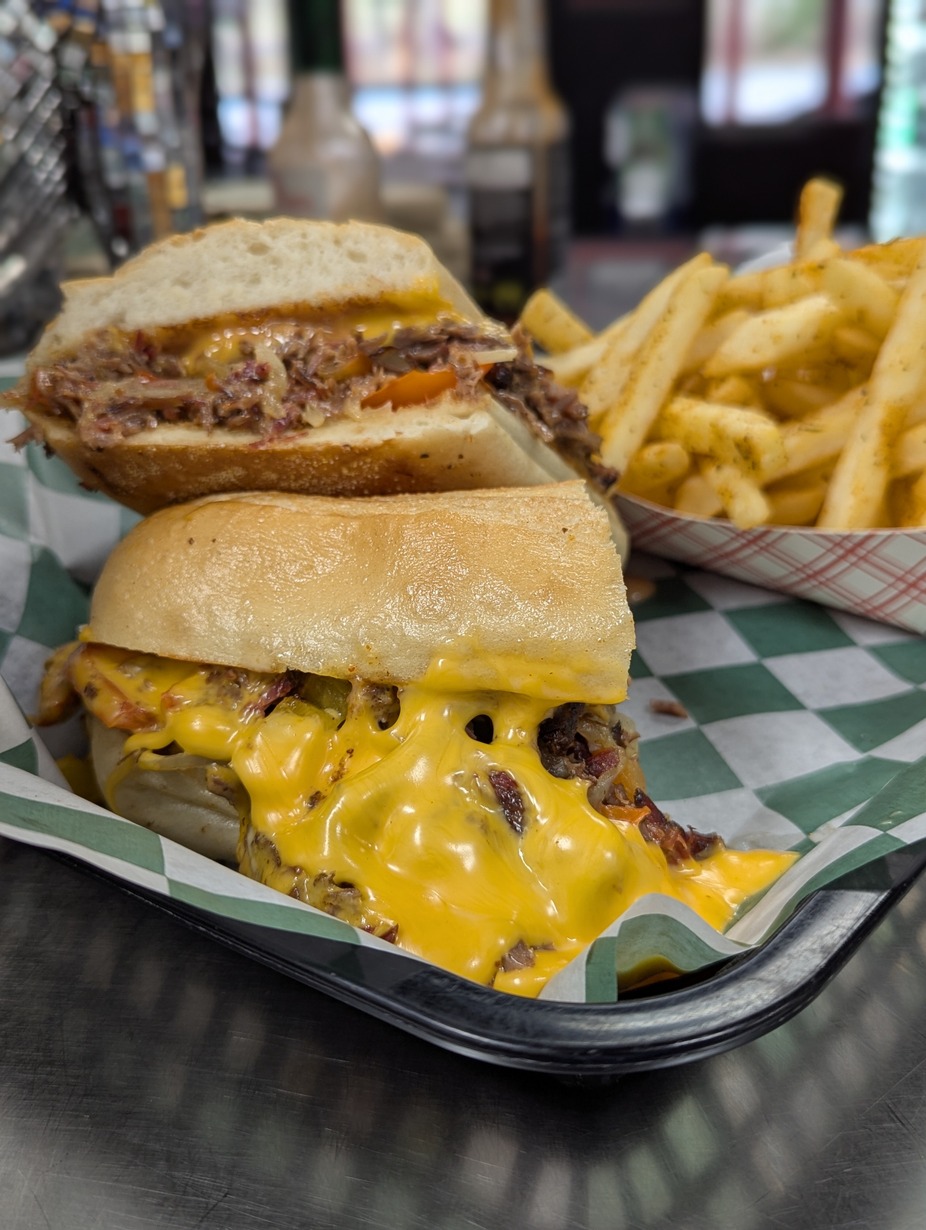 Brisket Cheesesteak - Brisket with Peppers & Onions, American Cheese and Mayo. Includes a side and a Drink for $18.00 **Upgrade your side to Okra or Onion Rings for $1.00