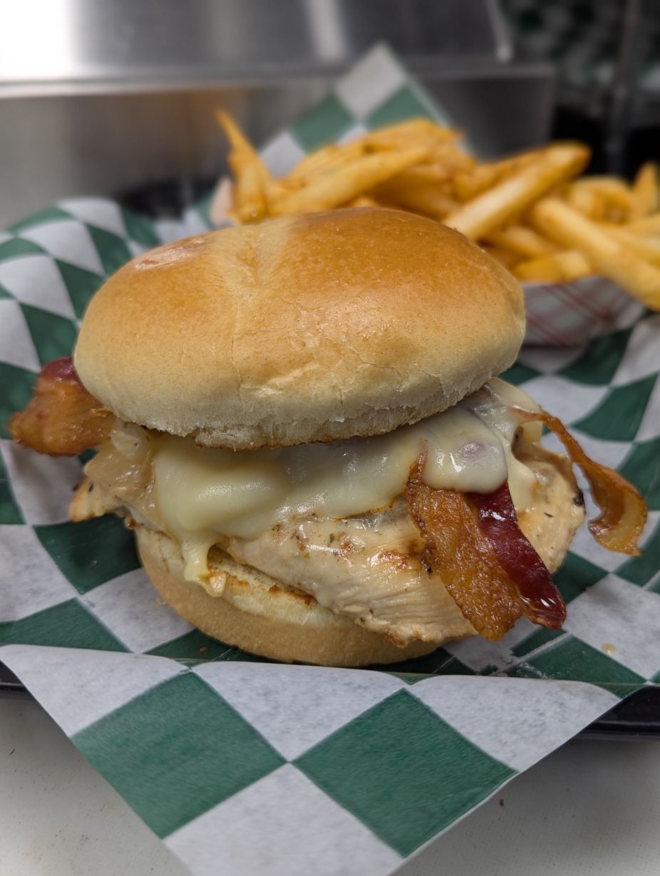 Chicken Marsala Sandwich - Grilled Chicken with Mushroom Marsala Cream Sauce, Bacon and Muenster Cheese. Includes a side and a Drink for $17.00 **Upgrade your side to Okra or Onion Rings for $1.00