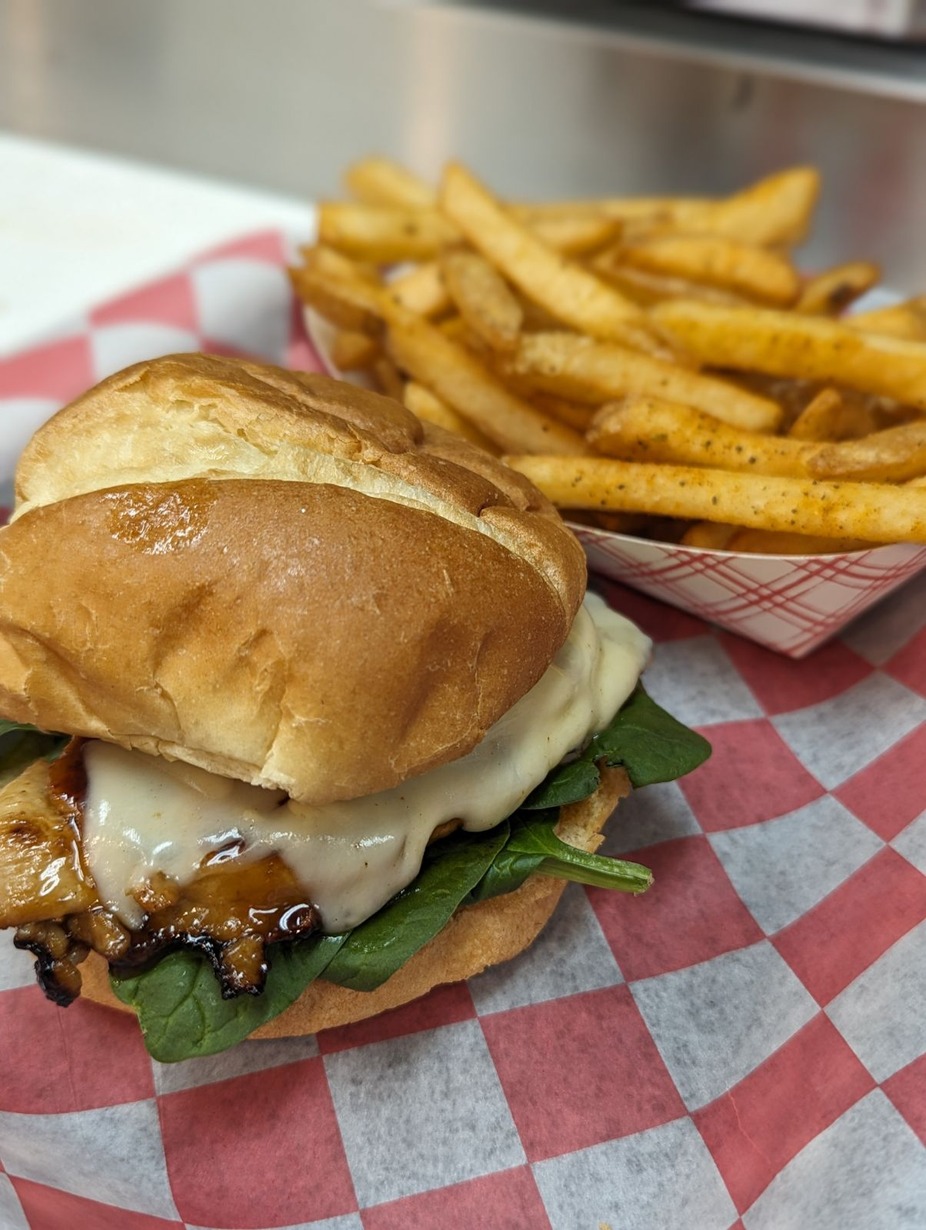Hawaiian Chicken Sandwich - Teriyaki Grilled Chicken with Swiss Cheese, Grilled Pineapple, Spinach and Teriyaki-Sriracha Aioli Includes a side and a Drink for $17.00 **Upgrade your side to Okra or Onion Rings for $1.00